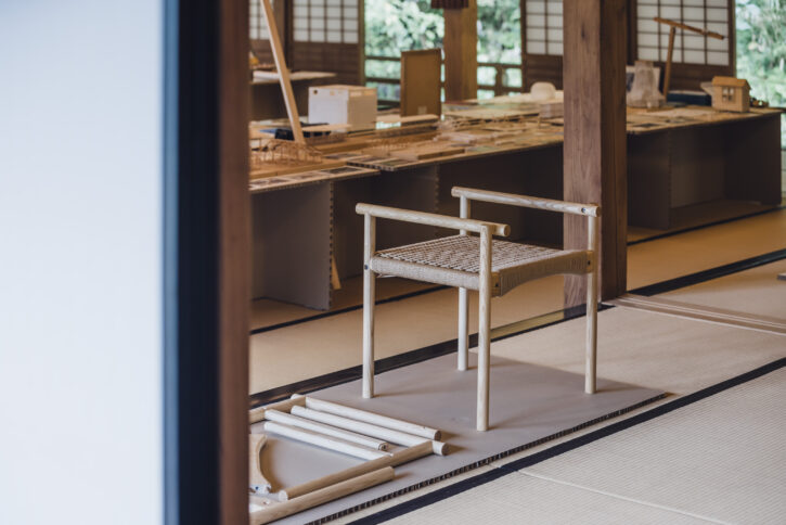 この軽量のアームチェアは、アッシュ材と紙コードで作られています。熊本の福祉法人の、障がいのある入居者の一人が持つ卓越したロープ編みの技術に着想を得ており、入居者自身が組み立てられるよう設計されているため、彼らの手仕事が空間に反映されます。
